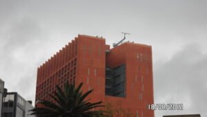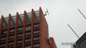 La volumetría del edificio tiene algunas fachadas inclinadas hacia afuera que después quiebran hacia adentro. Además, el recorrido sobre la azotea es discontinuo. Por lo tanto es necesario que el brazo de la góndola tenga un alcance horizontal de 13 metros, además de un mecanismo de acercamiento (pantógrafo) para la canastilla. Los movimientos de giros y elevación y descenso están controlados por variadores de velocidad electrónicos.