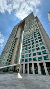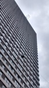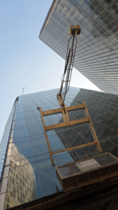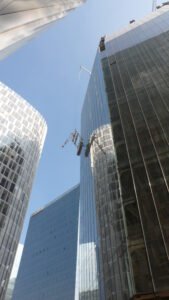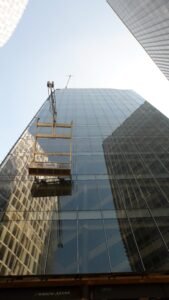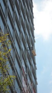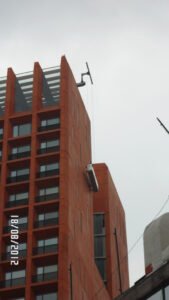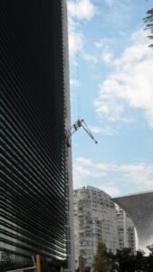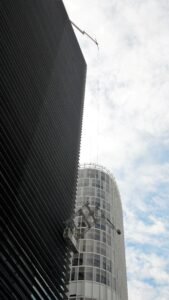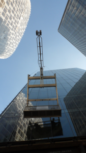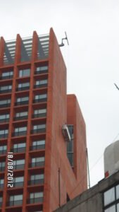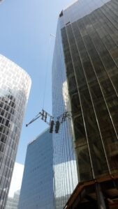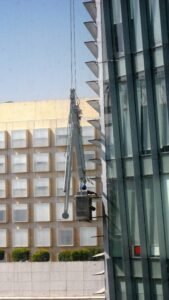 Las necesidades de esta torre son muy similares a las del primer edificio del conjunto: Fachadas inclinadas y remetidas. La solución: brazo con alcance de 13 metros y mecanismo de acercamiento para la canastilla (pantógrafo).