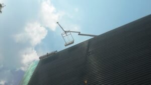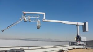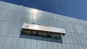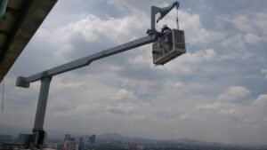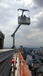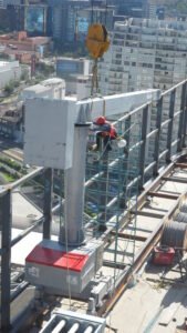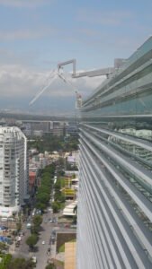 Debido a que los rieles donde corre la góndola están muy separados de las fachadas, la máquina requirió de un brazo con alcance de 10 metros.
