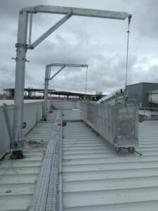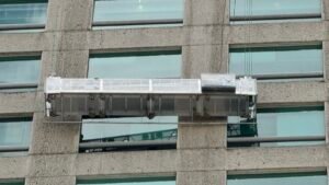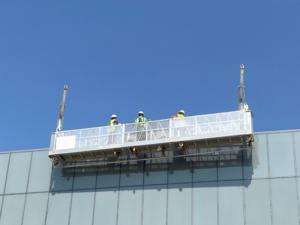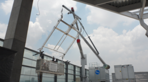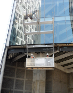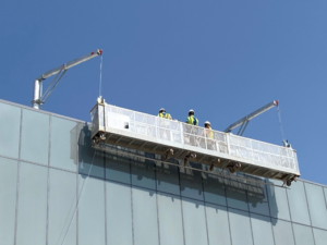 La configuración de la azotea no permite que el recorrido de la góndola sea continuo. Por lo tanto, la góndola tiene un brazo de 10.5 metros de alcance horizontal a fin de llegar a la parte central de la fachada sur.