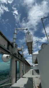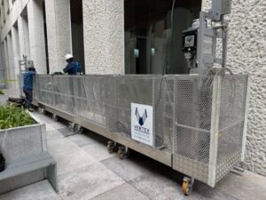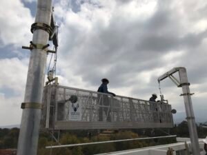 Se diseñó un sistema modular que pudiera elevarse en piezas pequeñas por el montacargas de la torre. La canastilla tiene 9 metros de longitud y los mástiles de aluminio están montados en carros motorizados.